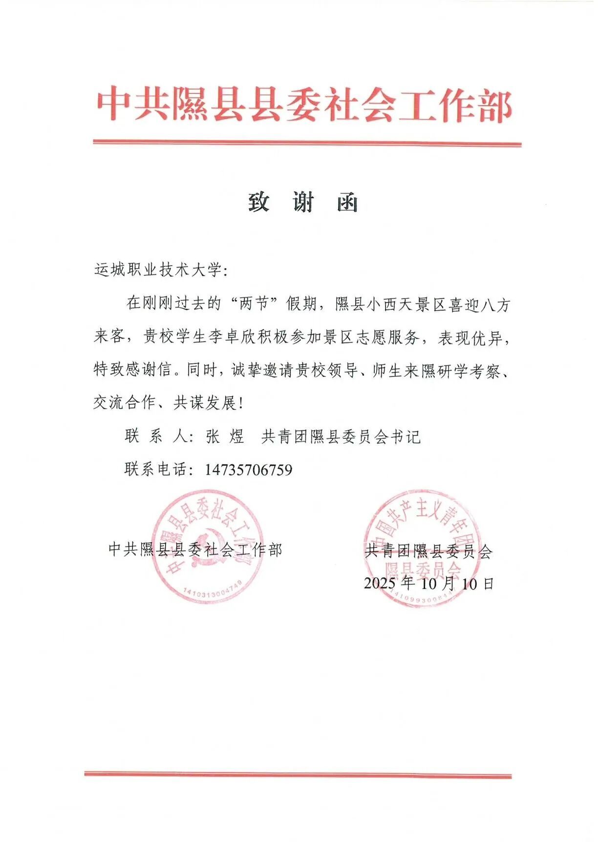 李卓欣同学的出色表现,是伟德国际victor1946育人成果的生动缩影。中共隰县县委社会工作部、共青团隰县委员会特地为此向我校发来感谢信,特别肯定了她“家国情怀与奉献精神兼具”的品质,同时向我校发出研学考察、交流合作的邀请——这份认可,是对李卓欣同学的褒奖,更是对伟德国际victor1946“培养有理想、敢担当、能奉献的青年人才”育人理念的肯定。